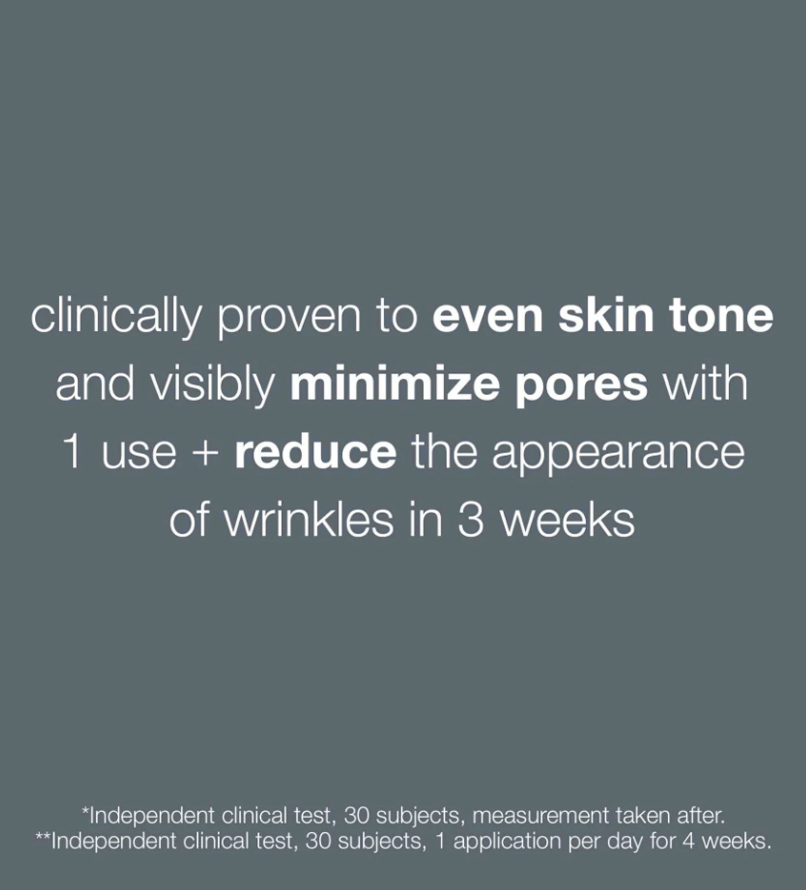 במחקר קליני שפורסם על ידי המותג נצפו שינויים במראה הגוון ובמראה הנקבוביות כבר לאחר כ־20 דקות מהשימוש הראשון — כפי שמופיע במקור.