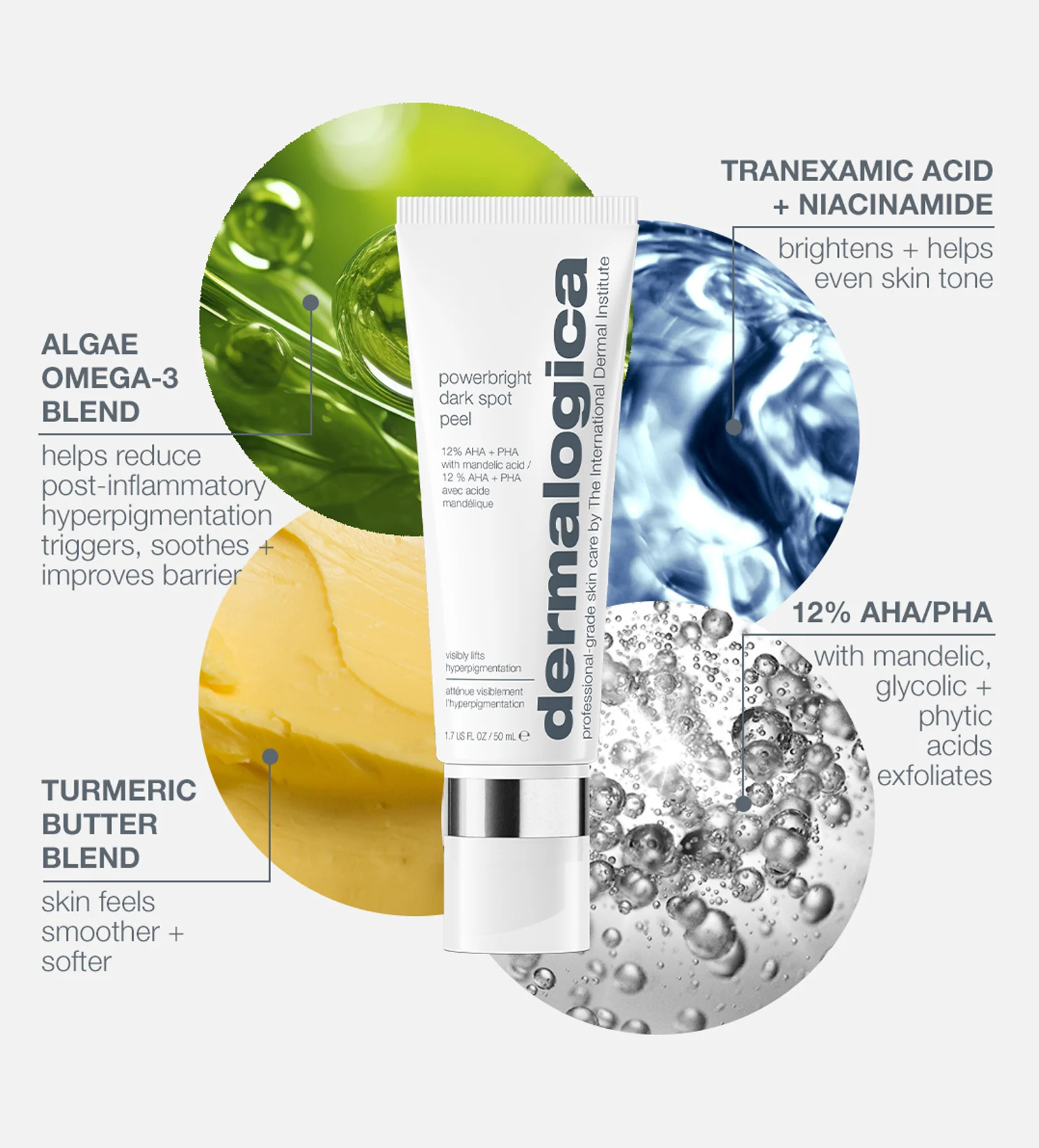 פורמולה פעילה ומהירה המכילה שילוב של חומצותAHA+PHA כולל חומצה מנדלית המסייעת בקילוף מהיר של מראה כתמים עקשניים. חומצה טראנקסאמית וניאצינמיד תורמים לאחידות בגוון העור. תערובת ייחודית של אומגה 3 משקמת את מחסום ההגנה הטבעי של העור ומסייעת להפחתת הגורמים שמעוררים היפרפיגמנטציה פוסט-דלקתית. השימוש בתכשיר מותיר את העור חלק ורך יותר.